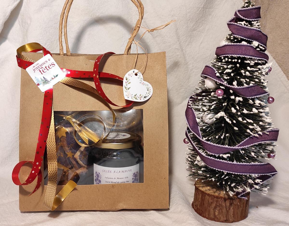 -un paquet de bredelas * 100g au sucre glace à la mauve et au bleuet et pétales de rose (tous les ingrédients sont issus de l'agriculture biologique)