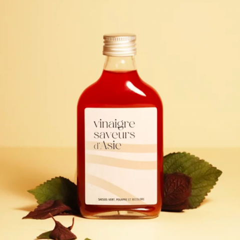 Vinaigre au shiso, plante asiatique aux saveurs herbacées et épicées, idéal pour une cuisine inventive et parfumée.